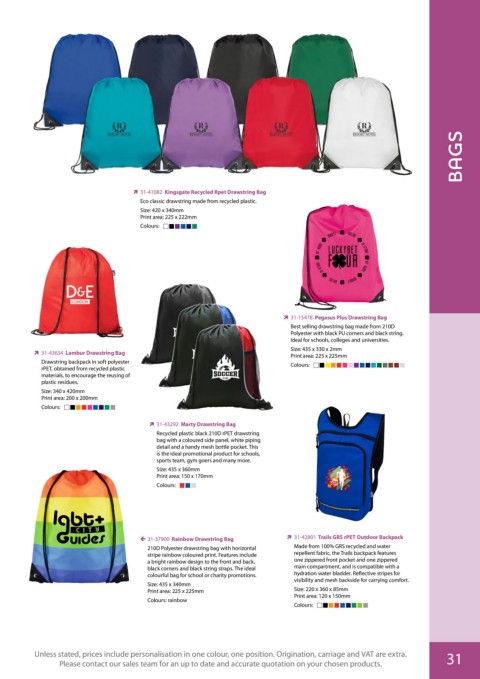 Unless stated, prices include personalisation in one colour, one position. Origination, carriage and VAT are extra. 31