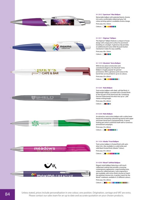 84 Unless stated, prices include personalisation in one colour, one position. Origination, carriage and VAT are extra.