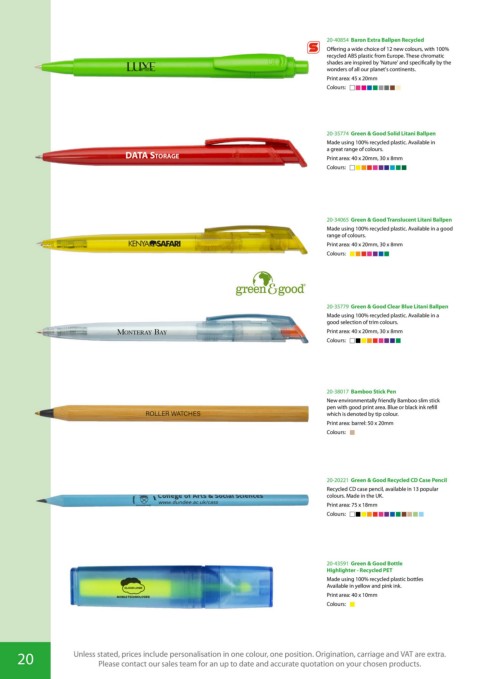 20 Unless stated, prices include personalisation in one colour, one position. Origination, carriage and VAT are extra.