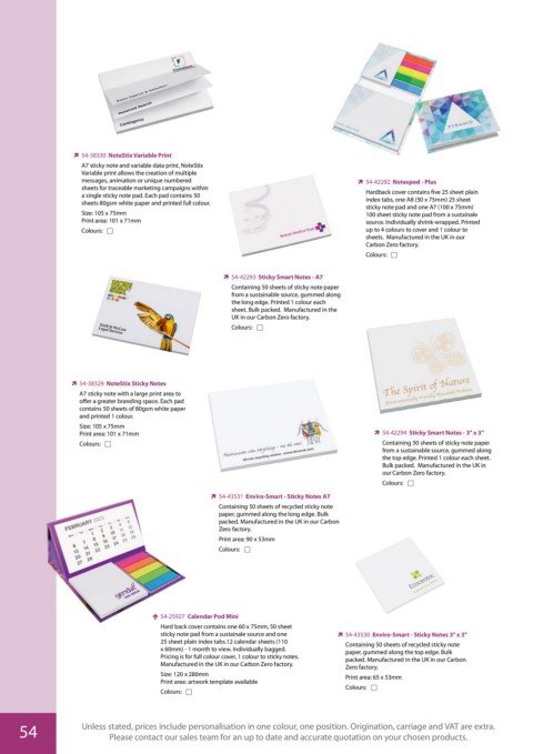 54 Unless stated, prices include personalisation in one colour, one position. Origination, carriage and VAT are extra.