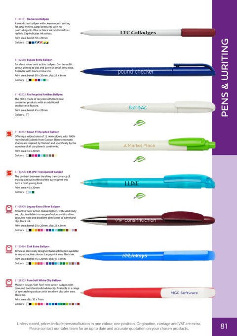 Unless stated, prices include personalisation in one colour, one position. Origination, carriage and VAT are extra. 81