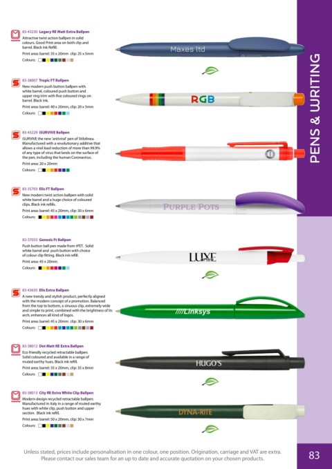Unless stated, prices include personalisation in one colour, one position. Origination, carriage and VAT are extra. 83
