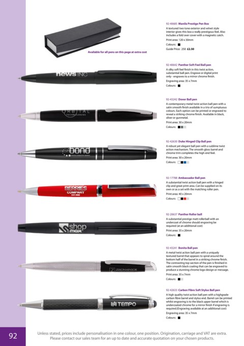92 Unless stated, prices include personalisation in one colour, one position. Origination, carriage and VAT are extra.