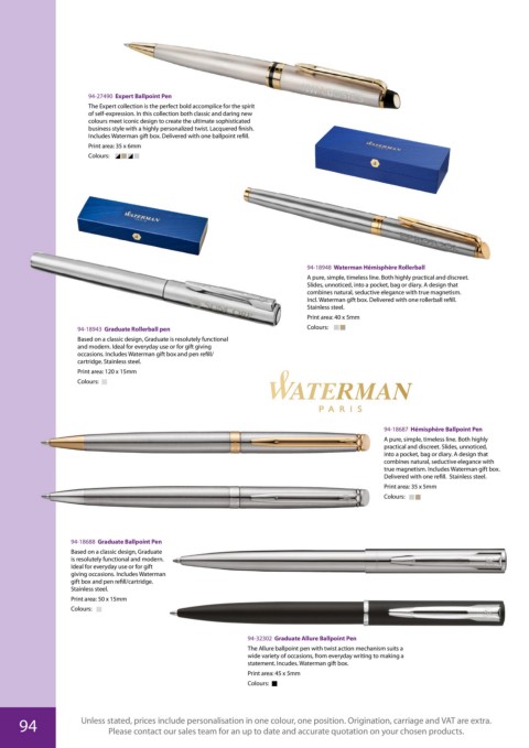 94 Unless stated, prices include personalisation in one colour, one position. Origination, carriage and VAT are extra.
